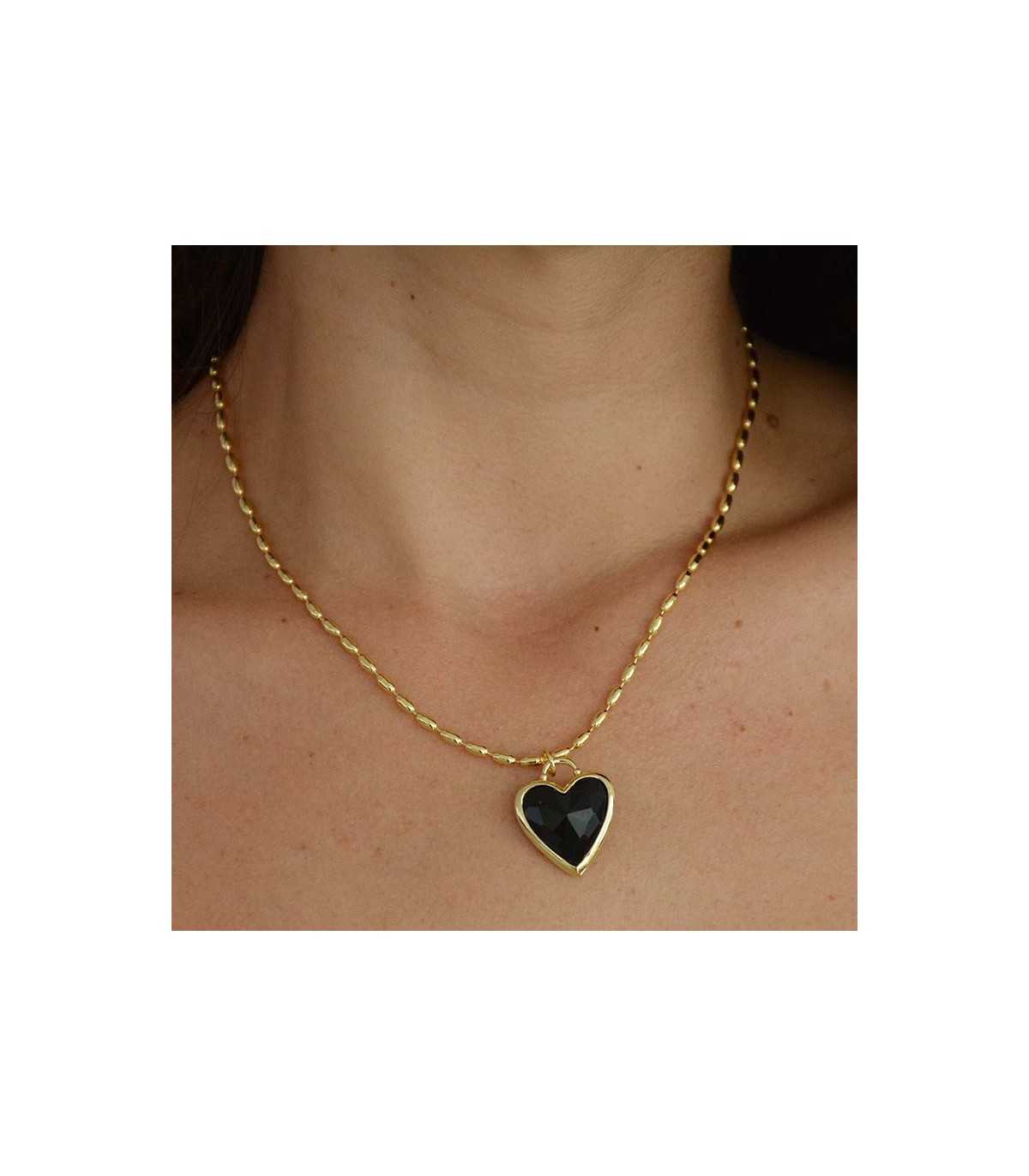 Dije de Ónix en forma de corazón con cadena de 45 hasta 50 cm, todo hecho de cobre y enchapado en oro de 18k.